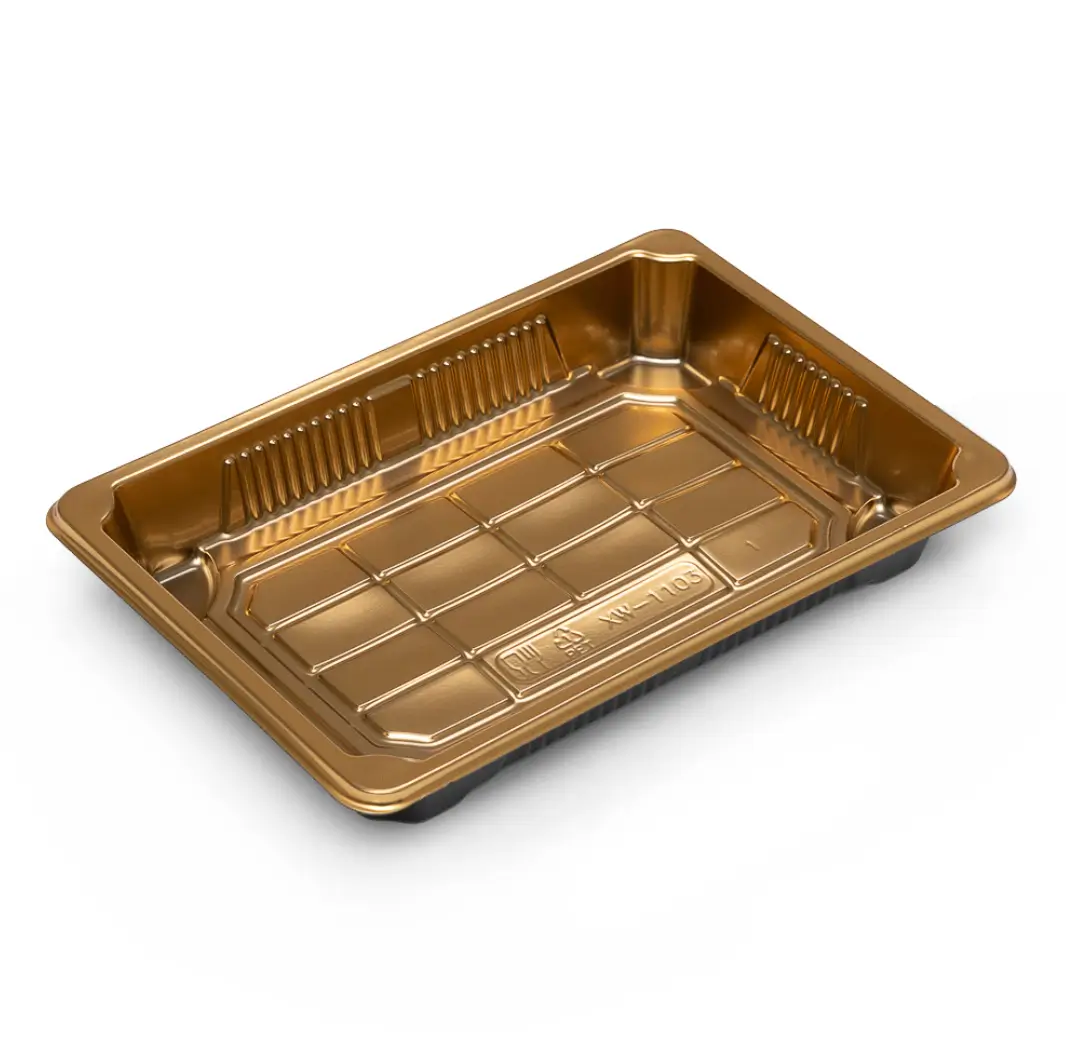 Aukštos kokybės suši dėžutė su permatomu dangteliu, skirta patogiam ir estetiškam maisto pateikimui bei transportavimui. Auksinės ir juodos spalvos derinys suteikia elegantišką išvaizdą, pabrėžiančią produkto vertę.
