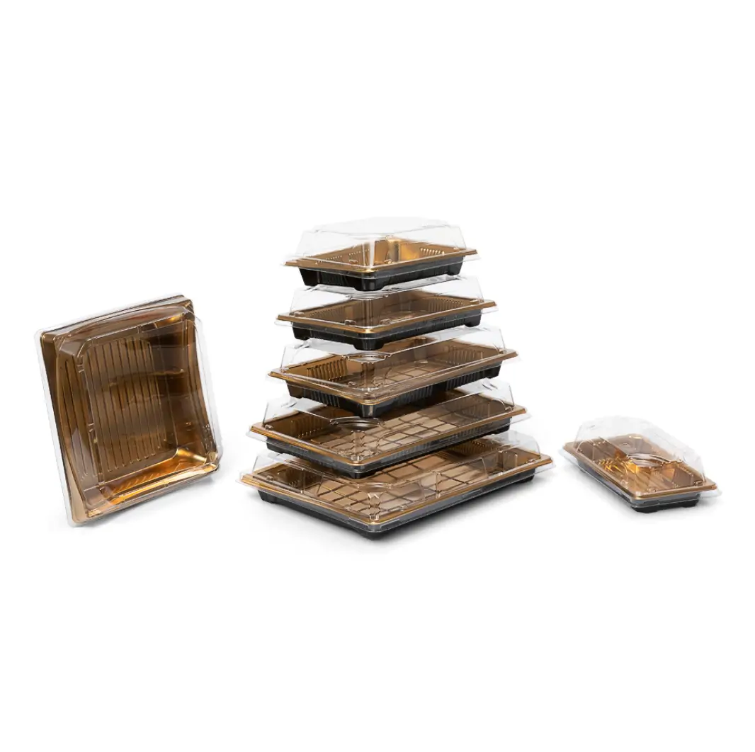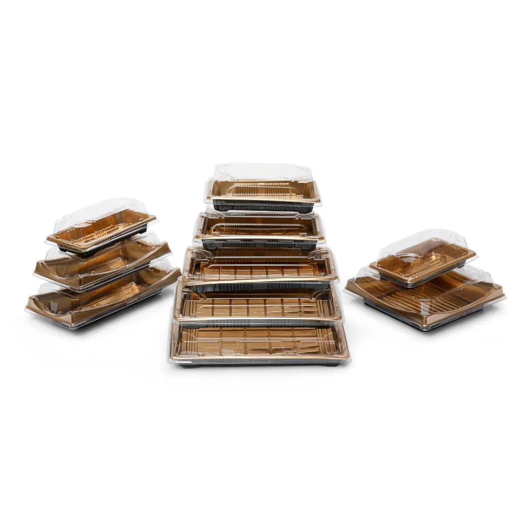 Aukštos kokybės suši dėžutė su permatomu dangteliu, skirta patogiam ir estetiškam maisto pateikimui bei transportavimui. Auksinės ir juodos spalvos derinys suteikia elegantišką išvaizdą, pabrėžiančią produkto vertę.